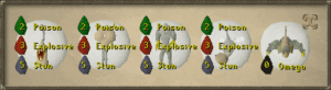 While non-attackers don’t need weapons, they can still benefit from filling their weapon and shield slots. Defenders can wear an imcando hammer to remove the need to collect a hammer for repairing traps. A Dinh’s bulwark is recommended if the player has a high enough Agility level to regenerate run energy fast enough. For a much lighter alternative, any Rune or better shield (ideally a fully charged Dragonfire shield) can be used alongside a Zamorakian hasta to provide decent crush and ranged defence bonuses. If those are unavailable, players can opt for Excalibur, a Rune/Dragon longsword, or the Ivandis/Blisterwood flail to still gain a +2 crush defence bonus. Excalibur also has an additional benefit of providing a Defence-boosting special attack which can be used at the start of every wave.