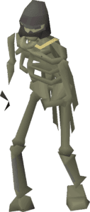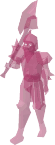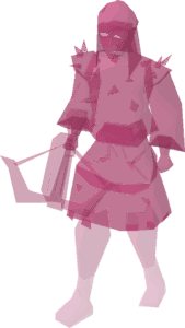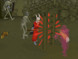 While underground anywhere in the Barrows area, the brothers’ faces will occasionally appear on-screen, draining a considerable amount of Prayer points every 18 seconds. The amount of Prayer drained begins at eight Prayer points, and increases by one for each brother killed, for a maximum of fourteen once all six brothers are killed. Since the area Prayer drain is so significant you ought to take several steps to speed up your kills and minimise the time you spend underground in order to save on Prayer potions and thus maximise profits. This effect can be nullified by equipping Ghommal’s hilt 2 or higher. It only needs to be wielded just before the drain effect activates, so one can keep a timer to track when this will occur and switch to a stronger offhand.