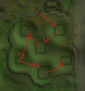 - Run east from Canifis, then south through the swamp. Turn east at the northmost hunter spot, loop around to the other nearby hunter spot, then run south-west to the swamp exit.
