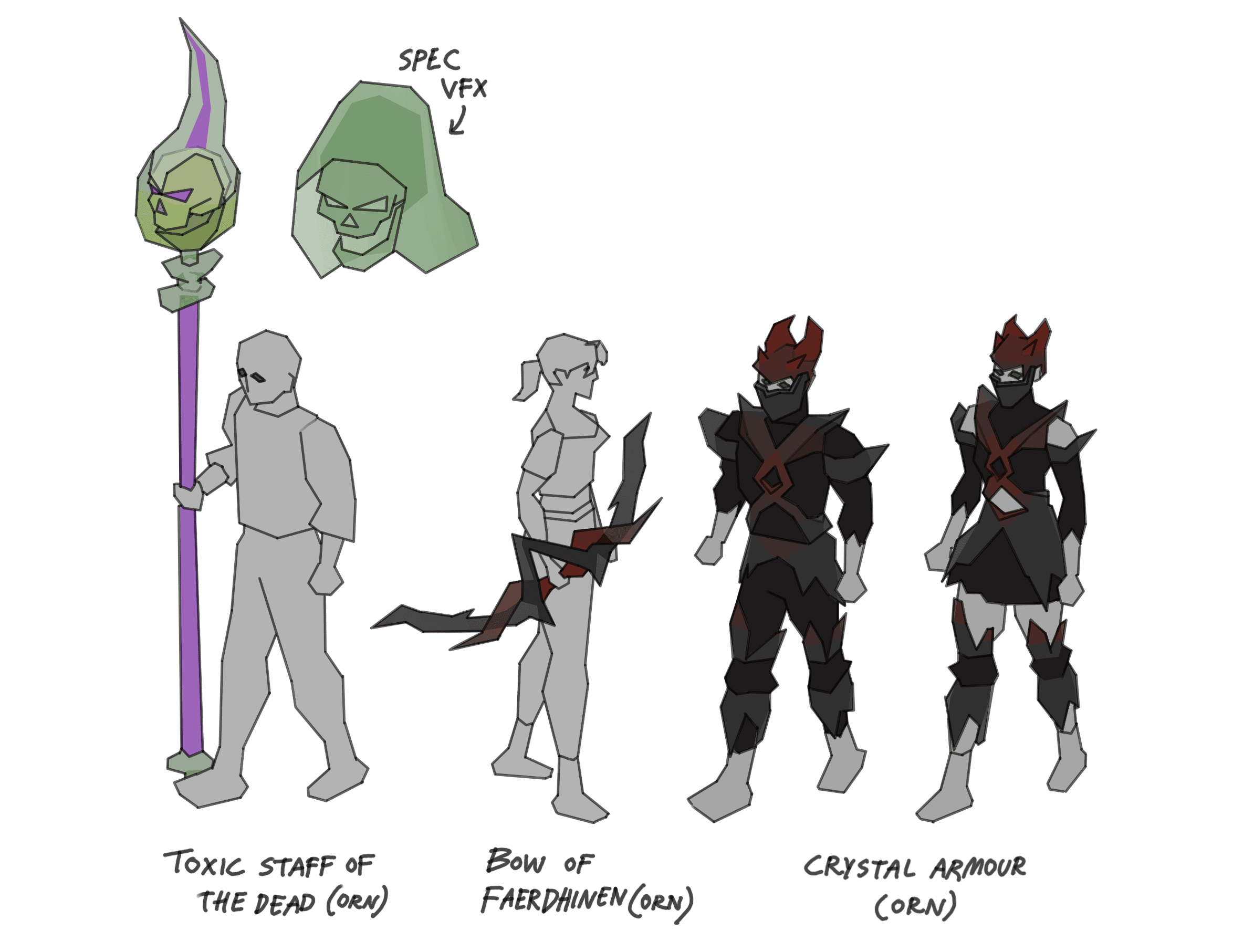 Last year’s suite of cosmetic overrides covered a lot of the main bases for PvP staples, but we’d like to throw a few more into the mix: the Toxic Staff of the Dead, the Bow of Faerdhinen, and Crystal armour.