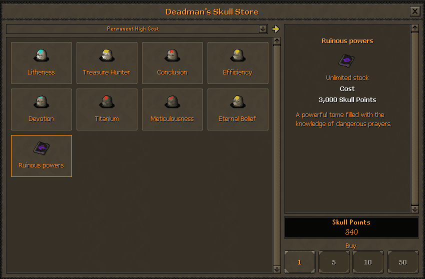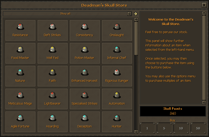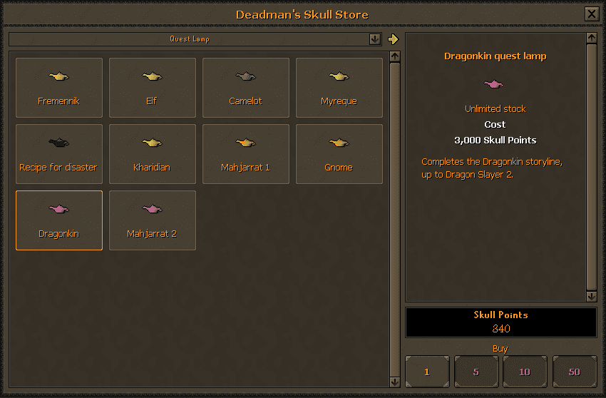For every Deadman Point you earn (by levelling up, killing bosses, completing Achievement Diaries etc.), you’ll also receive a Skull Point. Skull Points will be used in the Deadman’s Skull shop to purchase Sigils, Quest completion lamps and ‘permanent character unlocks’.
