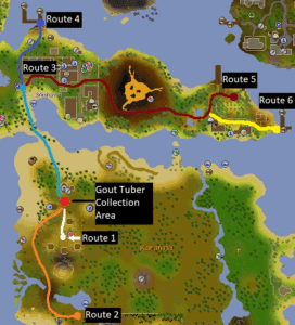 Gout tubers are collected from the village of Tai Bwo Wannai, on the island of Karamja. Tai Bwo Wannai is an isolated village, resulting in a long walk if not using a direct teleport. For the tank method, the Dense jungle directly west of the Tribal Statue will be used. For the snake boxing method, the jungle sections farther west will be used (reference map for location). Methods for getting there are in descending order of speed: