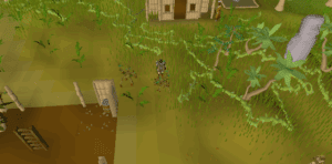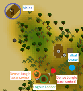 The shown location for the tank method has two sections of dense jungle close together. This spot is also located directly beside the tribal statue, which acts as an altar. South-west of the dense jungle spot is a ladder leading into a jungle home. Climbing this ladder allows for quick world hopping, and losing aggression from monsters. The shown location for the snake boxing method on the western side of this hut.