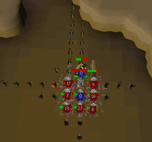 There are different methods to stack the maniacal monkeys for solo players. See the gallery below for the three most common methods. Higher click-intensity methods may provide higher experience rates as you will hit larger amounts of monkeys. While Ice Burst and Barrage hit a maximum of 9 targets, Chinchompas have a higher limit of 11 targets, making high-intensity methods more efficient and worthwhile when training Ranged compared to Magic.