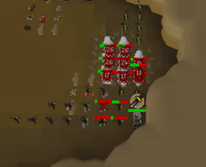 Using the special attack of a Crystal halberd or dragon halberd when it is available, optionally with the death charge spell if training Ranged, provides about 50,000 experience per hour in Attack, Strength, or Defence while only slightly reducing magic or ranged experience and supplies used per hour – this can be efficient depending upon the player’s goals. If using this method, it is advisable to prefer melee strength over prayer bonus or magic/ranged accuracy in slots where gear would not increase the Magic or Ranged hit – for instance, using a Mixed hide cape or a Fire cape over Ava’s accumulator, or a Berserker ring (i) over a Ring of shadows. Bringing divine strength potions, switching to an offensive prayer and wearing the best strength-boosting gear while using the halberd’s special attacks is advised (or a Void melee helm if the player is using the void armour).