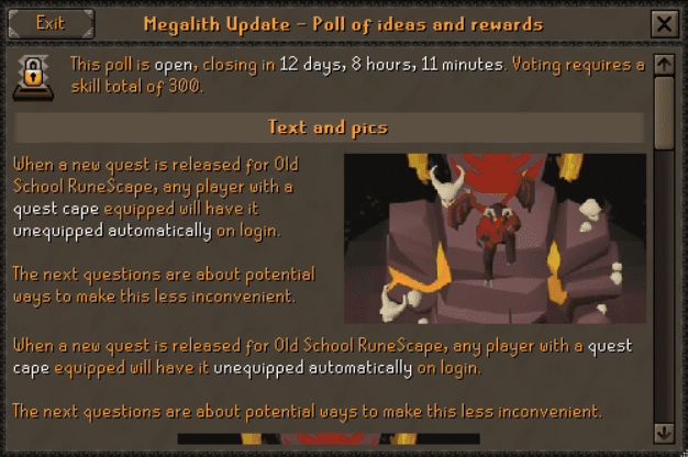 Polls can now include text blocks, images, and headers – even direct links to blogs for more context. No more flipping between the game and your browser just to understand what you’re voting on. Polls are now as readable and informative as a proper Old School news post – just with more voting.