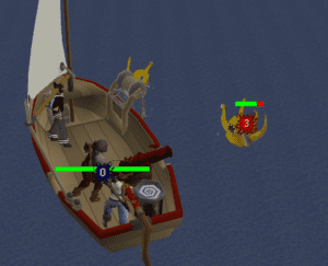 Ship combat involves players using their ship’s cannons to engage in combat with various sea creatures found throughout the oceans and seas of Gielinor. To engage in combat with a sea monster, the cannon itself must be facing the monster. Upon engaging in combat, the player’s hitpoints are replaced with the health of the ship or raft. Ship combat provides very little experience, far less than most other content but often makes up for it as a supplement when doing bounty tasks.